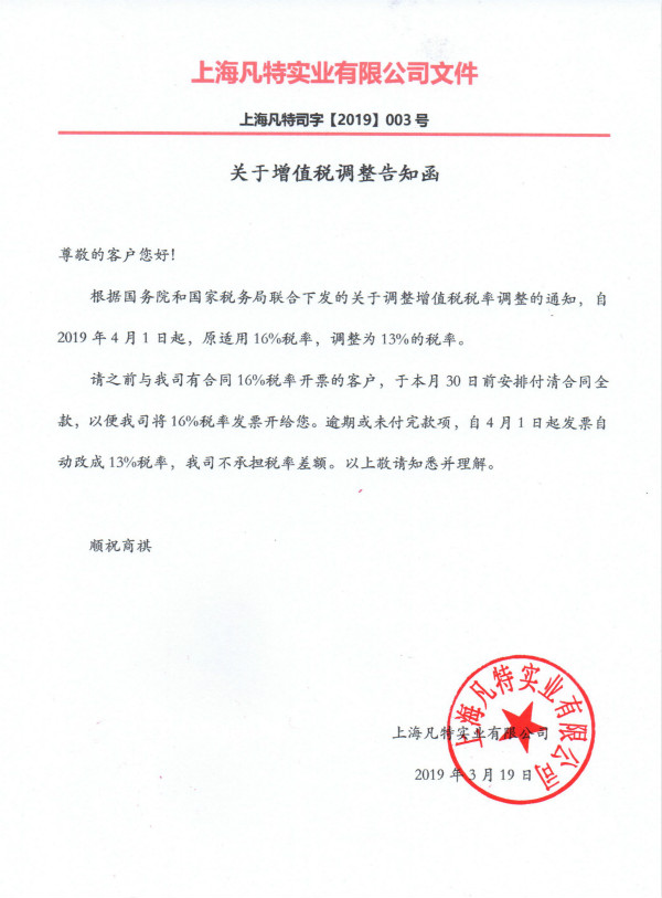 請之前與我司有合同16%稅率開票的客戶,于本月30日前安排付清合同全款,以便我司將16%稅率發(fā)票開給您。逾期或未付完款項(xiàng),自4月1日起發(fā)票自動(dòng)改成13%稅率,我司不承擔(dān)稅率差額。以上敬請知悉并理解。