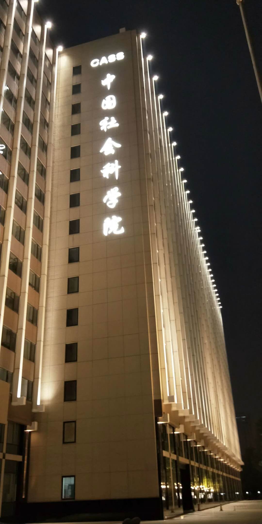 設(shè)置不同的場(chǎng)景模式可以讓夜色中的照明無(wú)需再在長(zhǎng)時(shí)間內(nèi)保持同一種過高的亮度照明需求,那樣所產(chǎn)生的電量也是沒有必要的。利用調(diào)光模塊可根據(jù)時(shí)間人流量大小來(lái)設(shè)定亮度,一鍵切換,方便快捷。下圖是社會(huì)科學(xué)院在夜色中的照明亮化。