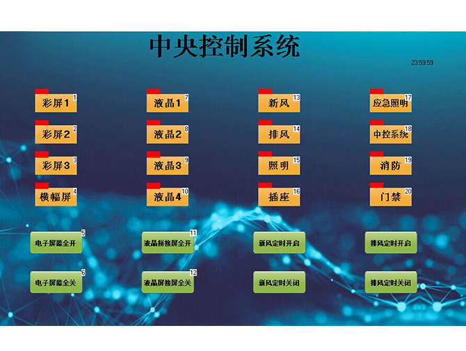 該項(xiàng)目采用VSU總線(xiàn)型智能照明控制系統(tǒng),網(wǎng)關(guān)主機(jī),電源模塊,級(jí)聯(lián)模塊,串口模塊加觸摸屏控制??赏ㄟ^(guò)中控觸摸屏一鍵控制電子屏幕、液晶拼接屏、新風(fēng)定時(shí)、排風(fēng)定時(shí)等。
