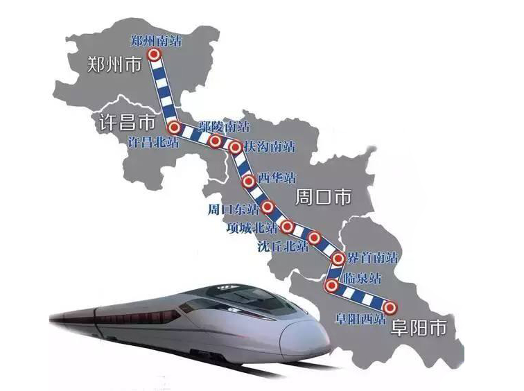 鄭阜鐵路北起鄭州南站,經(jīng)河南鄭州、開封、許昌、周口,進(jìn)入安徽省阜陽,接入商合杭鐵路阜陽西站,線路全長267公里,工程總投資約427.2億元,其中安徽段長65公里,投資140億元,設(shè)計(jì)行車時(shí)速350公里。全線設(shè)鄭州南、許昌北、鄢陵南、扶溝南、西華、周口東、淮陽、沈丘北、界首南、臨泉、阜陽西等11座車站。鄭阜高鐵計(jì)劃今年8月開始聯(lián)調(diào)聯(lián)試,年內(nèi)建成通車,并與商合杭鐵路銜接,延伸到杭州。屆時(shí)鄭州到阜陽僅需1個(gè)多小時(shí),鄭州到合肥僅需兩個(gè)多小時(shí),到杭州也僅需3個(gè)多小時(shí)。