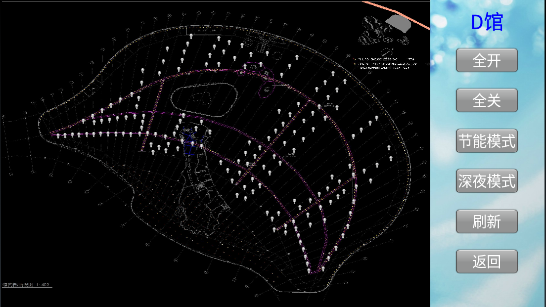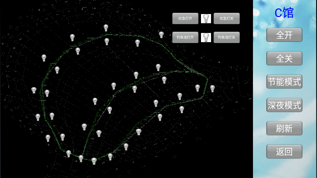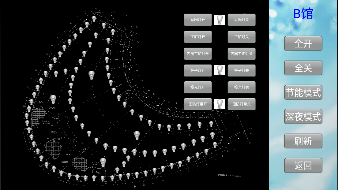 智能照明控制系統(tǒng)對(duì)各個(gè)場(chǎng)館內(nèi)的照明納入到統(tǒng)一的系統(tǒng)平臺(tái)進(jìn)行集中管理,實(shí)現(xiàn)一鍵全開(kāi)全關(guān),游樂(lè)園可根據(jù)不同節(jié)日預(yù)設(shè)不同燈光場(chǎng)景,增添假日氣氛,也可根據(jù)客流量預(yù)設(shè)燈光(如下圖:節(jié)能模式),在保持照明需求以及氛圍感的同時(shí),實(shí)現(xiàn)節(jié)能減排。