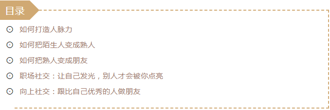 你認(rèn)識(shí)誰(shuí)比你知道什么更重要,愿意為你搭橋、為你背書、助你成功這才是真正有意義的人脈。保有一顆孩童般的好奇心,對(duì)世界、對(duì)他人真正的感興趣,渴望通過(guò)人和人的交往看到更廣闊的的世界,通過(guò)對(duì)人的深入了解而認(rèn)識(shí)他們的本真。真誠(chéng)、溫暖是敲門磚。把你的真誠(chéng)用言語(yǔ)、行動(dòng),傳達(dá)給對(duì)方,讓對(duì)方感受到你的光和溫度,被你吸引。為他人創(chuàng)造價(jià)值是引路燈,做事絕不要從利己和功利的角度出發(fā),而是首先想到如何為對(duì)方創(chuàng)造價(jià)值。