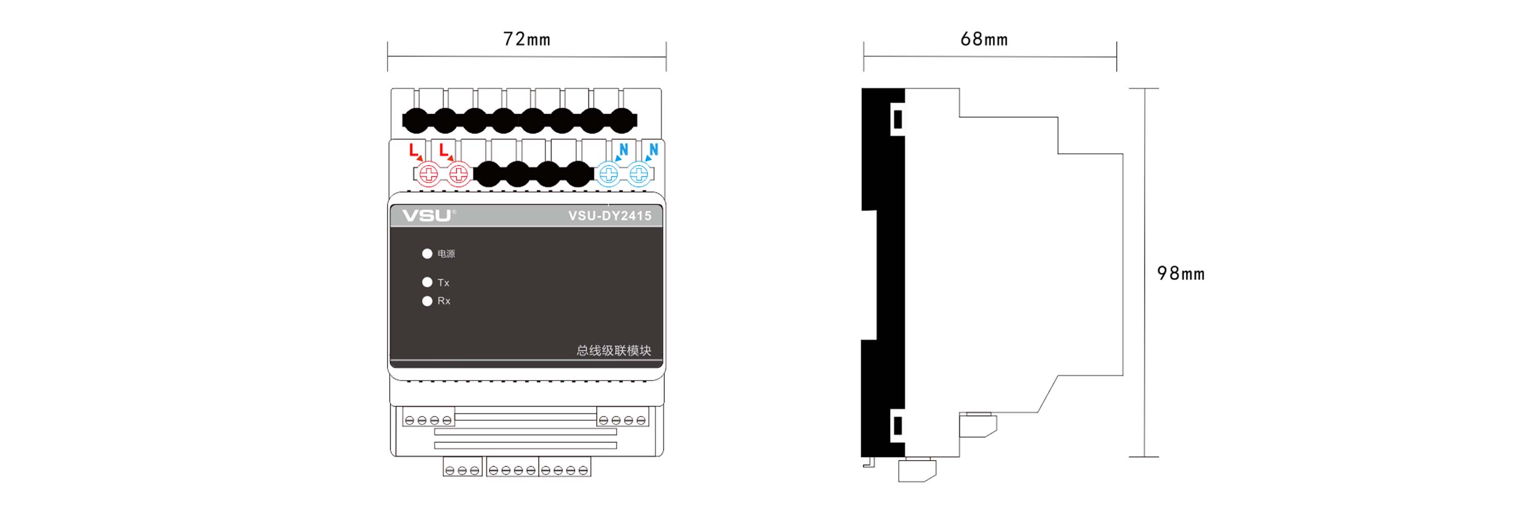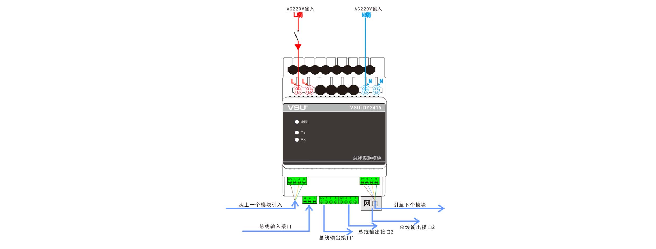 | 1,AC 110~AC220 V寬壓供電,采用工業(yè)級(jí)DC-DC隔離電源模塊,提供24V,0.8A; 2,內(nèi)置進(jìn)口全隔離VSU-Net通訊芯片,輸入輸出雙隔離; 3,導(dǎo)軌式安裝,占4個(gè)模數(shù)位,符合VSU-Net總線標(biāo)準(zhǔn); 4,獨(dú)有的隔離保護(hù)電路,可帶電熱插拔; 5,凈化總線拓?fù)洵h(huán)境,有效延長(zhǎng)VSU-Net通訊距離200m左右; | 1,供電電壓:AC110-AC220V; 2,符合標(biāo)準(zhǔn): VSU-Net總線標(biāo)準(zhǔn); 3,輸出電壓:DC24,0.8A; 4,傳輸延時(shí):≤ 10uS; 5,延長(zhǎng)距離:200米; 6,工作溫度/濕度:-0 — 45℃/20% — 93%RH; 7,存儲(chǔ)溫度/濕度:-40℃ — 55℃/10% — 93%RH; 8,外觀尺寸:72mm(L)×98mm(W)×68mm(H); 9,重         量:233g; | 本產(chǎn)品用于對(duì)VSU-Net差分通信信號(hào)的通信距離延長(zhǎng)與通信隔離,可以使VSU-Net信號(hào)延伸200米左右的距離,同時(shí)提供24V,0.8 A 電源可供5個(gè)總線模塊供電,通信信號(hào)輸入輸出雙重隔離為VSU-Net通信提供了有效的保護(hù)。具有抗干擾能力強(qiáng)、傳輸距離遠(yuǎn)、速率高、工作穩(wěn)定等特點(diǎn)。 |