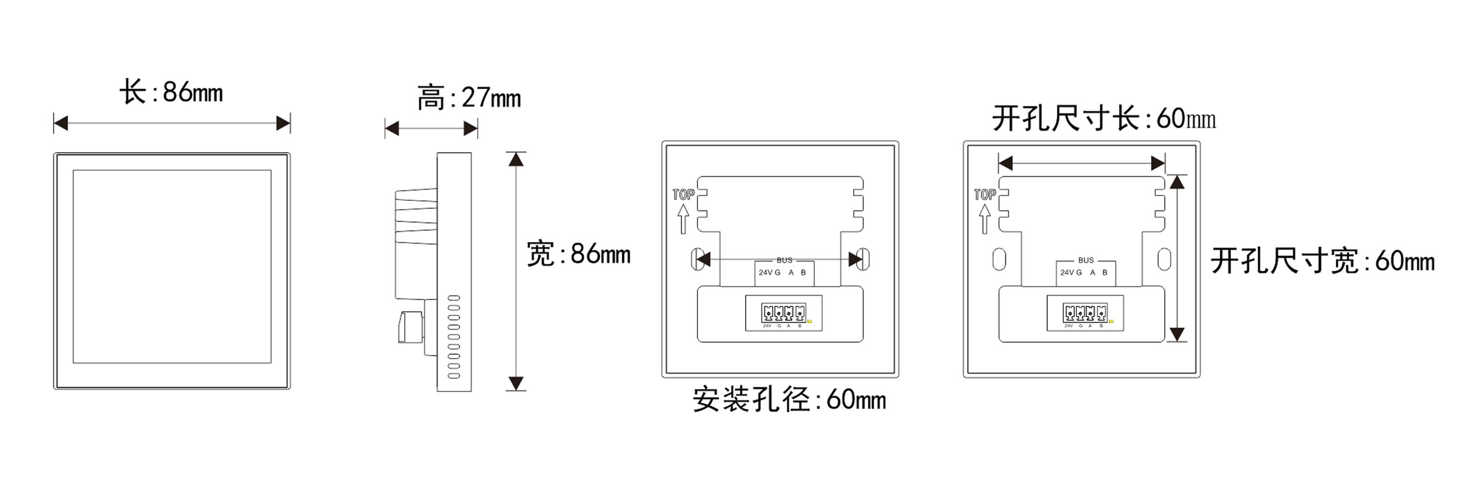 | 1,86底盒安裝,通用性強(qiáng); 2,每頁(yè)面可以內(nèi)置255個(gè)按鍵(按項(xiàng)目需要配置); 3,可提供數(shù)據(jù)類溫度、濕度、電量、照度等顯示; 4,4寸真彩色工業(yè)級(jí)屏幕,480×480高分辨率; 5,單個(gè)操作可觸發(fā)多條指令,支持雙向通信; 6,操作界面可編輯,圖形界面支持圖片、圖形、文字、3D按鍵; 7,65K色階,16位RGB; 8,支持TF卡下載工程; 9,提供開(kāi)放式界面編輯平臺(tái)。 | 1,供電電源:DC 24V; 2,最大功耗:1.5W; 3,待機(jī)功耗:0.72W; 4,觸屏尺寸:4寸; 5,屏幕彩色:65K色,16位RGB; 6,觸屏方式:電容屏; 7,屏幕分辨率:480×480; 8,安裝方向:支持0、90、180和270度旋轉(zhuǎn)安裝顯示; 9,外框顏色:黑色; 10,通信接口:VSU-Net; 11,工作溫度濕度:-10 ~ 60℃/20% ~ 93%RH; 12,存儲(chǔ)溫度濕度:-15℃ ~ 65℃/10% ~ 93%RH; 13,外觀尺寸:(L)86mm×(W)86mm×(H)27mm; 14,重量:118g/pcs; | 標(biāo)準(zhǔn)86盒安裝,4寸真彩屏,單控開(kāi)關(guān)、窗簾和場(chǎng)景總線控制,可自定義界面支持3D文字、3D圖片,個(gè)性化界面;用于集中控制,支持雙向通信,安裝方便,接口靈活,適用于各種多媒體中央控制系統(tǒng)。