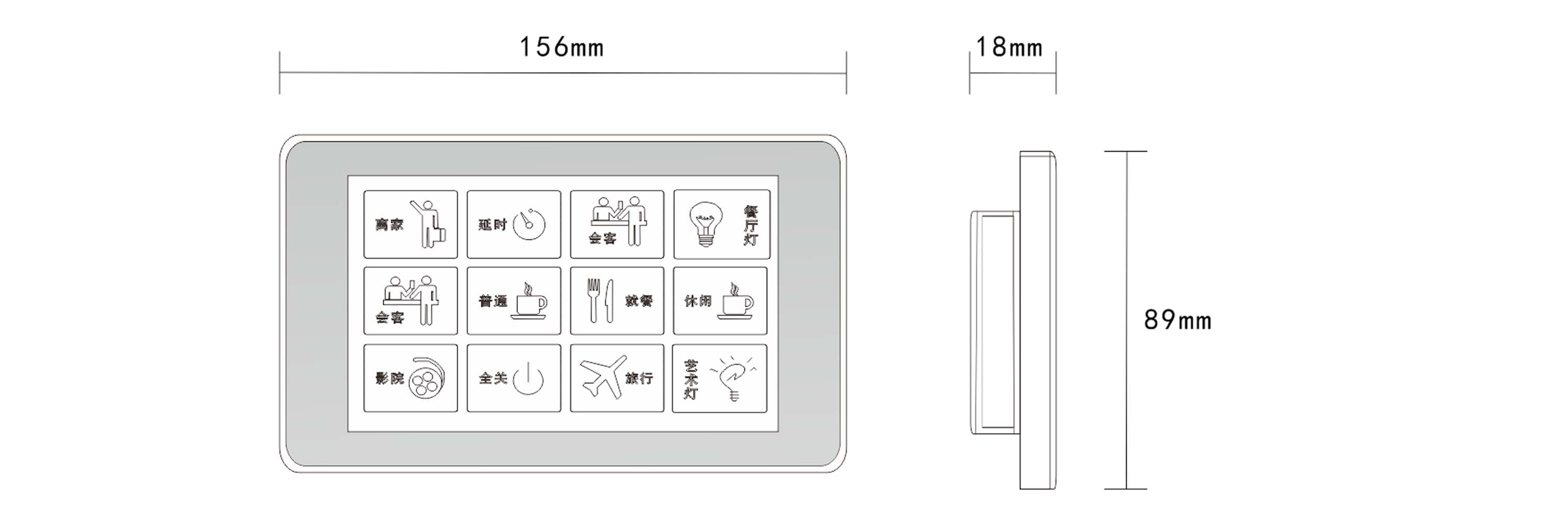 1,供電電壓:DC 24V; 2,最大功耗:3.38W; 3,待機(jī)功耗:0.6W; 4,觸屏尺寸:5寸; 5,屏幕彩色:65K色,16位RGB; 6,觸屏方式:電容屏; 7,屏幕分辨率:720×1280; 8,安裝方向:支持0、90、180和270度旋轉(zhuǎn)安裝顯示; 9,外框顏色:銀色拉絲; 10,通信接口:VSU-Net; 11,工作溫度濕度:-0 ~ 45℃/20% ~ 93%RH; 12,存儲(chǔ)溫度濕度:-40℃ ~ 55℃/10% ~ 93%RH; 13,外觀尺寸:(L)156mm×(W)89mm×(H)18mm; 14,重量:549g/pcs; | 標(biāo)準(zhǔn)146盒安裝,5寸真彩屏,單控開(kāi)關(guān)、窗簾和場(chǎng)景總線控制,可自定義界面支持3D文字、3D圖片,個(gè)性化界面;用于集中控制,支持雙向通信,安裝方便,接口靈活,適用于各種多媒體中央控制系統(tǒng)。 |