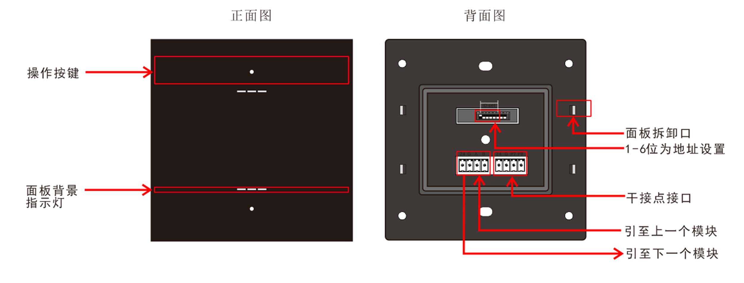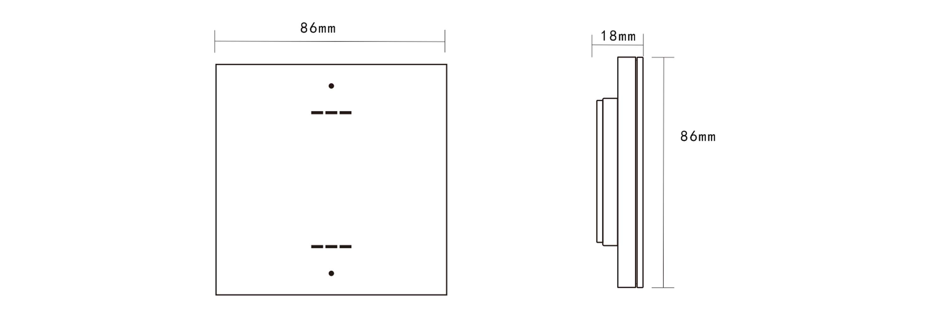9,運行溫度/濕度:0℃~45℃/20%~93% RH; 10,儲存溫度/濕度:-40℃~+55℃/10%~93%RH; 11,外觀尺寸:86mm×86mm×18mm; 12,重量:75g/pcs; | 標準86底盒安裝,支持無縫聯(lián)接,提供2鍵,每個按鍵帶1路LED指示燈,復(fù)位式輕觸開關(guān),結(jié)構(gòu)成熟,性能穩(wěn)定,標準工藝,采用塑料材質(zhì)(顏色可選灰色、黑色和香檳金);自帶感應(yīng)式背光燈;提供兩路IO輸入可外接傳感器。 |