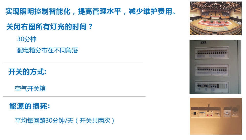 除了耗電量大,傳統(tǒng)照明控制還有一個(gè)無法長存的原因,那就是不便管理。傳統(tǒng)照明控制皆采用本地式一開一關(guān)的控制方式,沒有簡(jiǎn)單的辦法實(shí)現(xiàn)全開全關(guān)。如上圖,在需要管理大面積燈光時(shí),需要到不同角落的配電箱旁邊才能操作,費(fèi)時(shí)費(fèi)力費(fèi)電。另外傳統(tǒng)照明控制所需的電力電纜較多,造成投資成本上升;沒有調(diào)光功能,亮度不合適時(shí)不能調(diào)節(jié),只能更換燈具;采用拇指開關(guān)或者翹班開關(guān)后無法再改變開關(guān)與燈具之間的對(duì)應(yīng)關(guān)系;沒有場(chǎng)景操作,布線太過復(fù)雜,難以實(shí)現(xiàn)多控......傳統(tǒng)照明控制存在著很多問題,小家庭也許體會(huì)不到傳統(tǒng)照明控制的不便,因?yàn)榧依餆艟咻^少,一間房間一兩盞就夠了,但許多大型商業(yè)綜合體,寫字樓,體育館,博物館等場(chǎng)所,面積大、燈具成區(qū)域控制無法總控,且只能使用手動(dòng)來開閉,其會(huì)造成很多多余工作量以及能源消耗。所以未來一定會(huì)進(jìn)入智能照明時(shí)代,與VSU一起進(jìn)入高效且節(jié)能的智能照明生活吧,VSU讓身邊更智能!