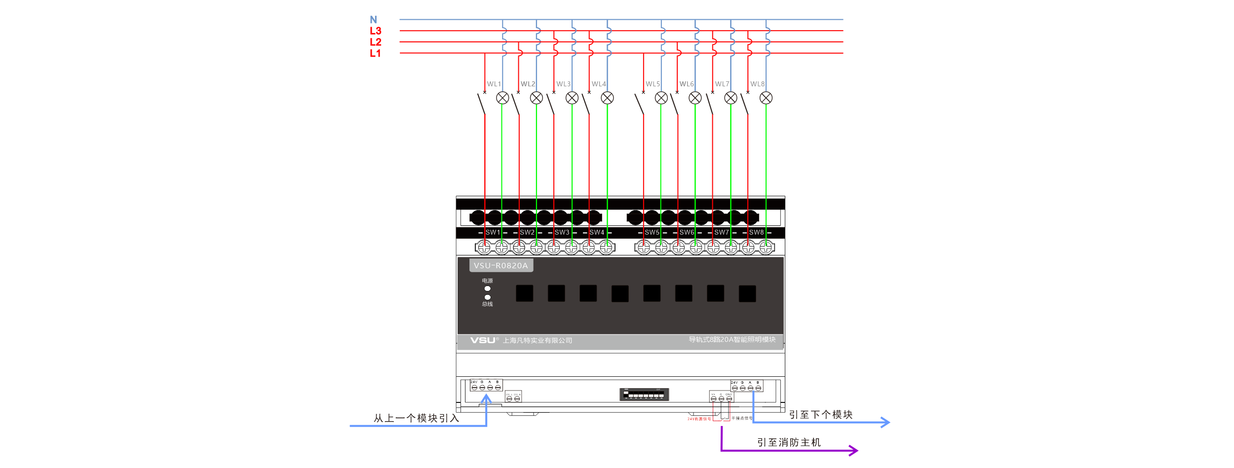 本產(chǎn)品為導軌式安裝,含8路智能繼電器,每回路可獨立控制4400W燈具的開關(guān),帶應急按鍵,LED燈時時指示各個回路開關(guān)狀態(tài),可設(shè)置為互鎖控制4組窗簾開合;